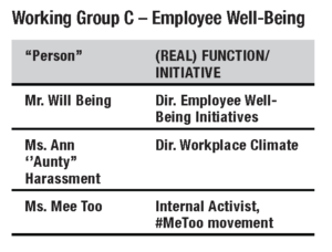 Here are the “people” (functions) who made up the 6 Working Groups. Together with Ms. Harriet Rose Job, they created outcomes that helped her organization survive COVID-19 and positioned it for success and value-adding initiatives post-COVID.